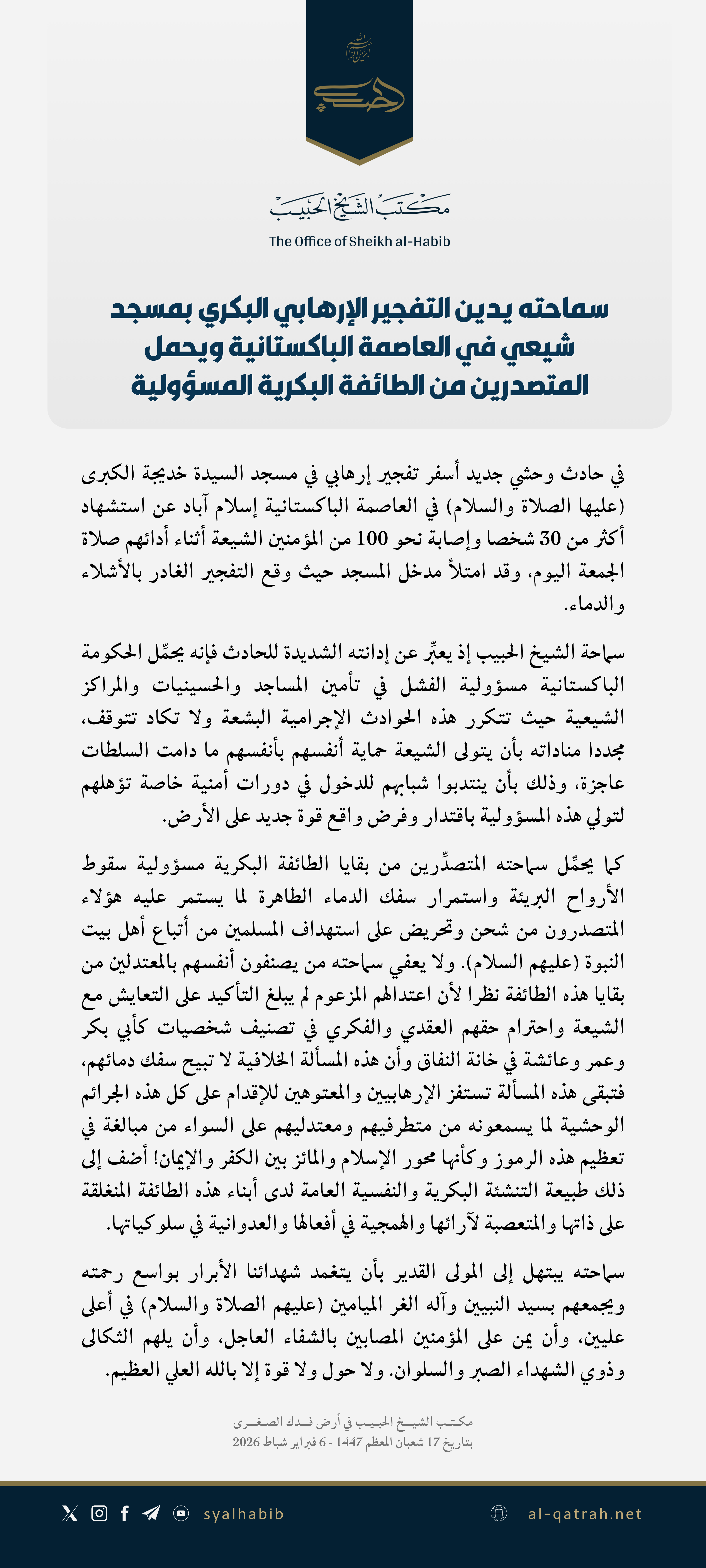 سماحة الشيخ الحبيب إذ يعبِّر عن إدانته الشديدة للحادث فإنه يحمِّل الحكومة الباكستانية مسؤولية الفشل في تأمين المساجد والحسينيات والمراكز الشيعية حيث تتكرر هذه الحوادث الإجرامية البشعة ولا تكاد تتوقف، مجددا مناداته بأن يتولى الشيعة حماية أنفسهم بأنفسهم ما دامت السلطات عاجزة، وذلك بأن ينتدبوا شبابهم للدخول في دورات أمنية خاصة تؤهلهم لتولي هذه المسؤولية باقتدار وفرض واقع قوة جديد على الأرض.